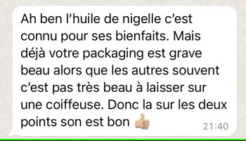 L’huile de nigelle est naturellement riche en acides gras essentiels et en antioxydants. Sa texture légère permet une pénétration rapide dans la peau sans laisser de film gras.